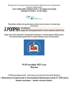 19–21 октября 2023 года в Москве в Институте русского языка Российского университета дружбы народов имени Патриса Лумумбы состоялся I Международный лингвокультурологический форум «Лингвокультурология и коммуникативная реальность XXI века: новые вызовы – новое осмысление». Конференция проводилась при поддержке Российского общества преподавателей русского языка и литературы.