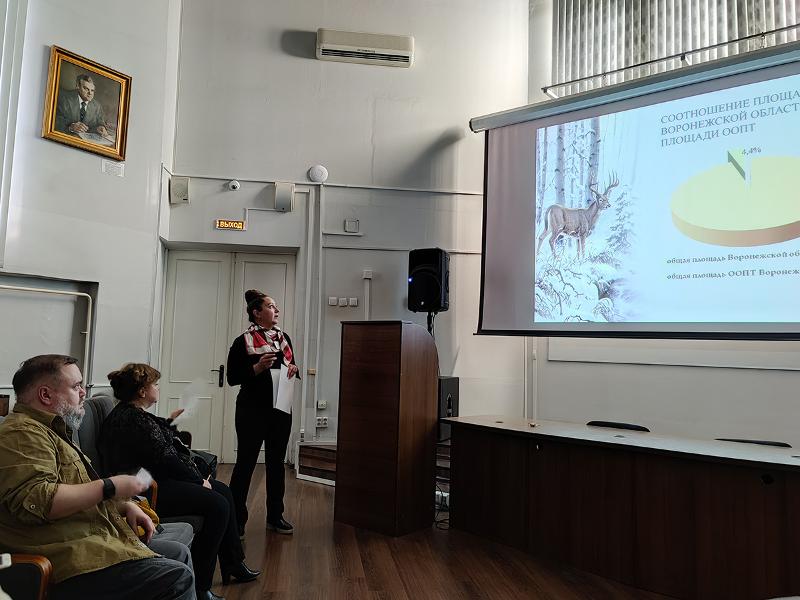 Воронежский государственный университет представили сотрудники медико-биологического факультета: доцент кафедры экологии и земельных ресурсов, кандидат биологических наук Лилия Алаева, ассистент кафедры экологии и земельных ресурсов Елена Негробова, ведущий инженер кафедры ботаники и микологии Оксана Негробова, с докладом на тему «Система особо охраняемых природных территорий Воронежской области».