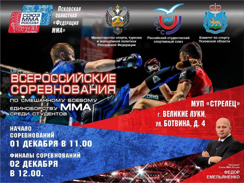 С 30 ноября по 2 декабря 2023 года в Великих Луках прошли Всероссийские соревнования среди студентов по смешанному боевому единоборству (ММА). В соревнованиях приняли участие около 100 спортсменов – студентов и аспирантов дневной формы обучения вузов в возрасте от 18 до 25 лет. Спортсмены представляли все субъекты России. Победители соревнований получили право без отбора выступить на Кубке России по ММА в 2024 году, а также выполнить нормативы мастера спорта РФ.