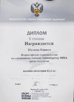 Студент 1 курса магистратуры факультета международных отношений ВГУ Кирилл Матвеев выступил в весовой категории до 61 кг и в упорной борьбе занял почётное 2 место. Тренер спортсмена – старший преподаватель кафедры физического воспитания и спорта Артур Масалов.