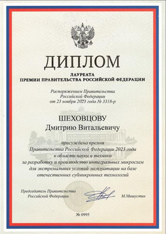 Старший научный сотрудник кафедры технологий обработки и защиты информации факультета компьютерных наук ВГУ, кандидат технических наук Дмитрий Шеховцов удостоен Премии Правительства РФ в области науки и техники за разработку и производство интегральных микросхем для экстремальных условий эксплуатации на базе отечественных субмикронных технологий.