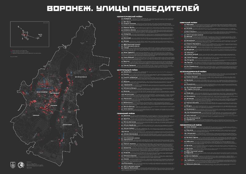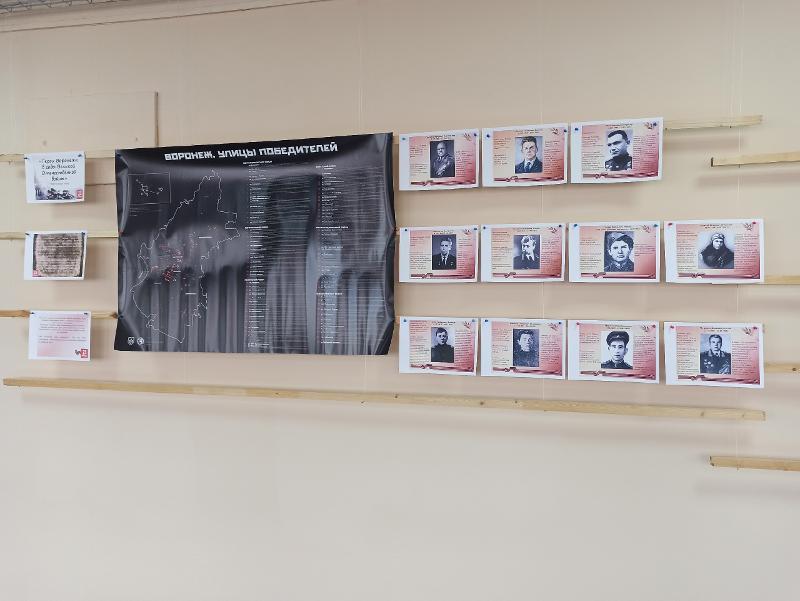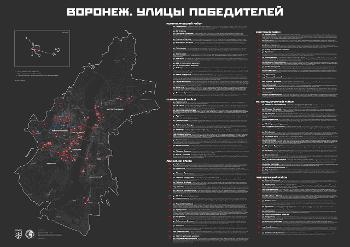 В честь героев области названы улицы Воронежа, которые как раз и отражены на карте «Воронеж. Улицы победителей». Здесь отмечены и улицы, носящие наименования победоносных дивизий и армий. Организацией широкоформатной карты «Воронеж. Улицы победителей» для выставки занялся студент 2 курса магистратуры, руководитель отдела СМИ студенческого совета Юлиан Поставничев-Харри.