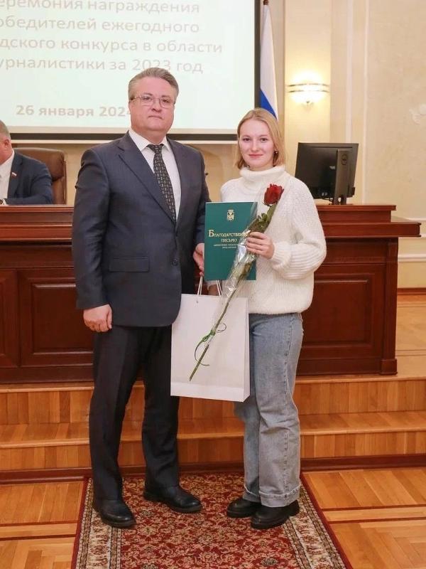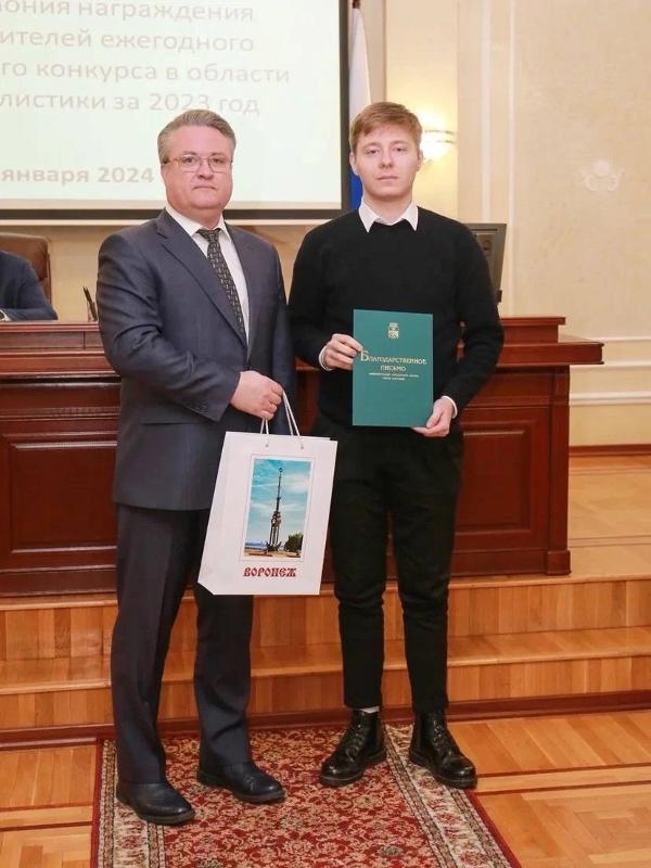 26 января в Воронежской городской администрации прошла церемония награждения победителей ежегодного городского конкурса СМИ. В мэрии отметили фильм «Беслан. Сердца, закалённые трагедией», созданный студентами факультета журналистики ВГУ Максимом Максимовым, Ильёй Шушковым, Екатериной Ивановой и студентом Липецкого технического университета Егором Евсеевым.