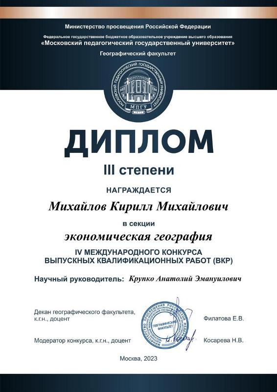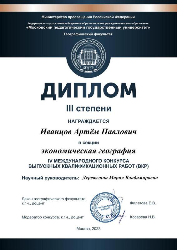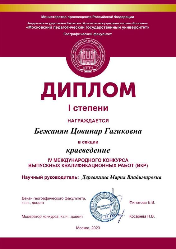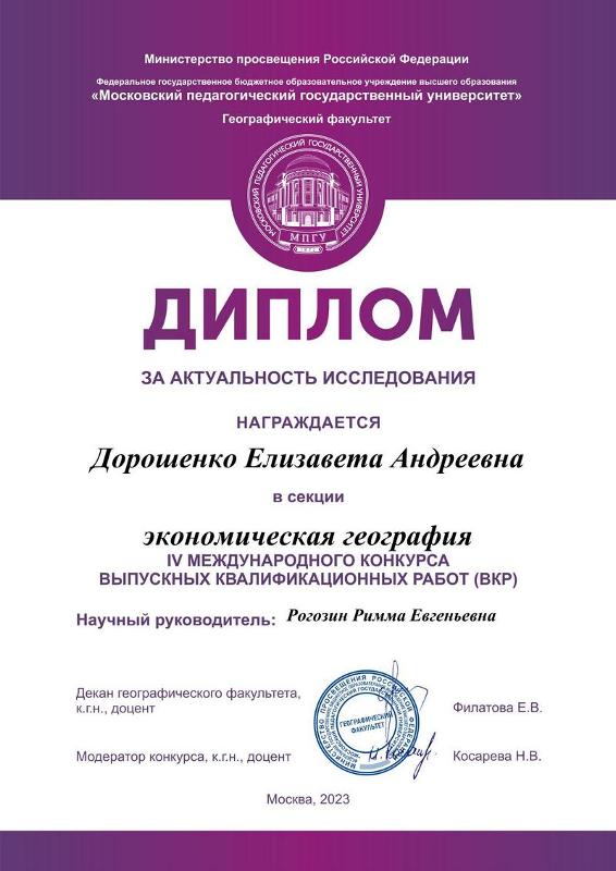 Географический факультет Московского государственного педагогического университета уже четвёртый год проводит Международный конкурс выпускных квалификационных работ. В этом году конкурс прошёл в двух группах – ВКР бакалавров и магистров по 10 секциям: Географическое образование, Гостиничное дело, Землеведение, Картография, Краеведение, Туризм, Физическая география, Цифровизация общества, Экология и геоэкология, Экономическая и социальная география. Конкурс проводили и среди ВКР учащихся колледжей по 2 секциям: Туризм и Гостиничное дело. На конкурс было подано 289 заявок из разных вузов и колледжей России и ближнего зарубежья. Факультет географии, геоэкологии и туризма ВГУ представляли семь студентов, четверо из которых стали победителями и призёрами в номинациях конкурса.