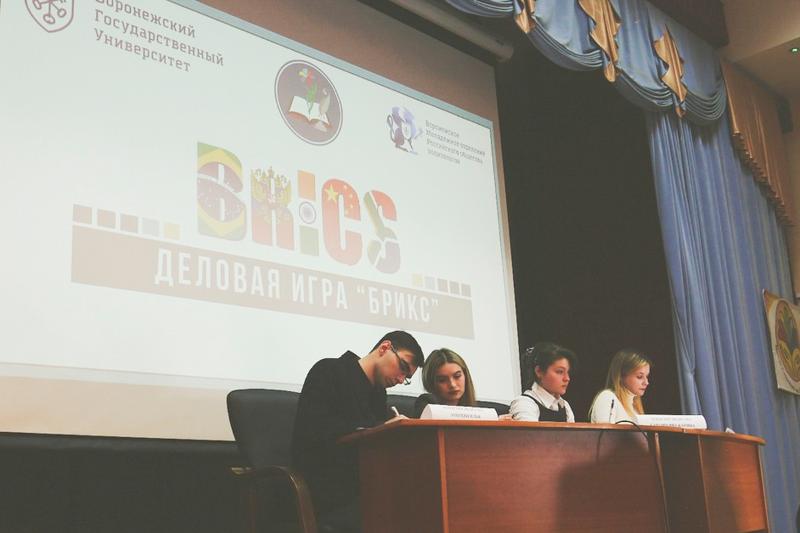12 марта студенты кафедры социологии и политологии исторического факультета ВГУ провели деловую игру, воссоздающую атмосферу саммита БРИКС, для учеников гимназии имени Платонова. Темой саммита стало развитие академической мобильности в рамках БРИКС.