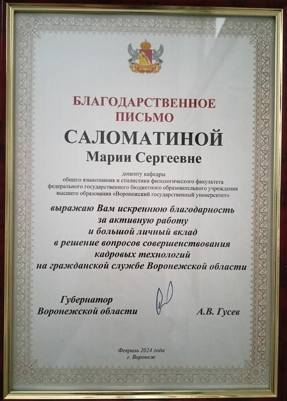 В официальном письме Губернатор Воронежской области выразил искреннюю благодарность доценту кафедры общего языкознания и стилистики за активную работу и большой личный вклад в решение вопросов совершенствования кадровых технологий на гражданской службе Воронежской области.