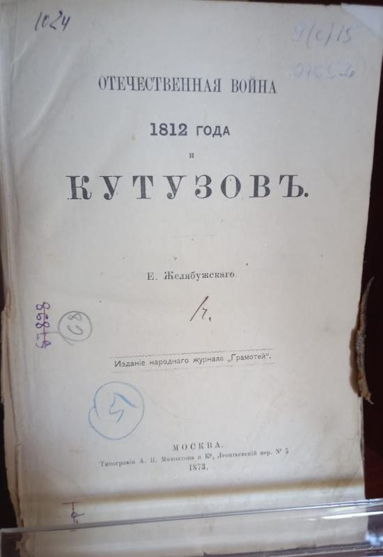Этой же теме посвящена книга «Отечественная война 1812 года и Кутузов» (Москва,1873 год), написанная Евгением Желябужским. В книге описана история Отечественной войны: её предпосылки и политическая ситуация в Европе, биография Михаила Кутузова, ход и значение Бородинской битвы. Также в ней представлены народные предания и песни про Отечественную войну, приводится описание рисунков, изображающих французов, стихотворения, относящиеся к Отечественной войне и её участникам.