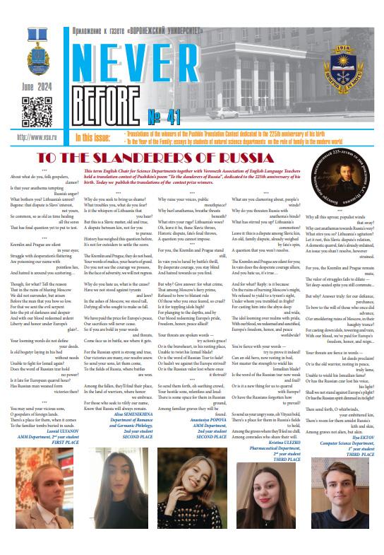 Опубликован новый выпуск приложения на английском языке «Never Before» к газете «Воронежский университет». Выпуск посвящён двум знаменательным событиям 2024 года – 225-летию со дня рождения А.С. Пушкина и объявленному в России Году семьи.