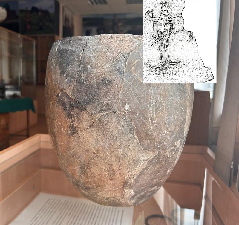 Изображение лыжника на сосуде из святилища Шиловского поселения по-настоящему уникально. Подобный сюжет, распространенный на севере, никто не ожидал встретить у скотоводов. Не случайно некоторые исследователи рассматривают его как отражение контактов с финно-угорскими племенами и связывают с мифом о Йиркапе – владельце чудесных лыж.