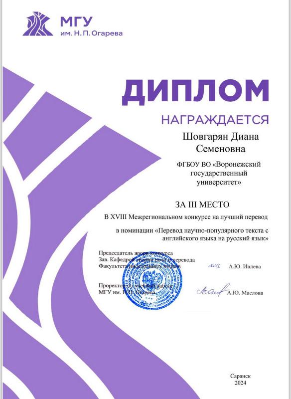 Диана Шовгарян стала призёром сразу в двух номинациях: с французским языком – 3-е место в номинации «Перевод научно-популярного текста с французского языка на русский язык» и с английским языком – 3-е третье место в номинации «Перевод научно-популярного текста с английского языка на русский язык»: