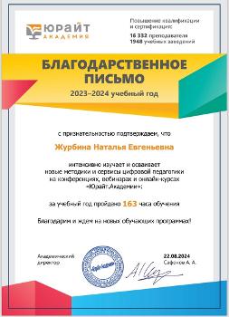 На основании цифровых данных 2023/24 учебного года, в течение которого было пройдено 163 часа обучения, руководство «Юрайт. Академии» приняло решение наградить Наталью Журбину именной благодарностью за интенсивное изучение и освоение новых методик и сервисов цифровой педагогики на конференциях, вебинарах и онлайн-курсах.