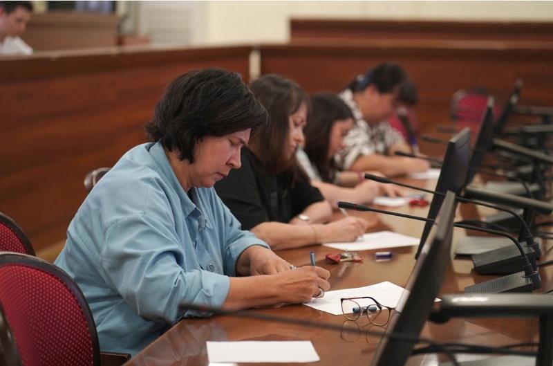 Студентов и сотрудников, желающих проверить свои знания в области русского языка, пригласили для написания диктанта 13 сентября в конференц-зал Главного корпуса. Диктант провела Александра Владимировна Рудакова, председатель оргкомитета конкурса, заведующий кафедрой общего языкознания и стилистики.