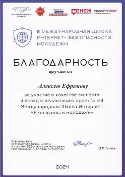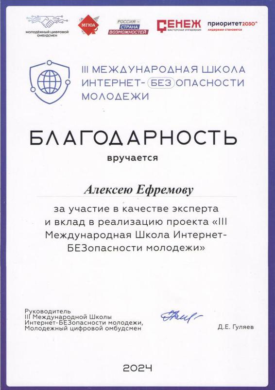 2–6 октября 2024 года в Мастерской управления «Сенеж» президентской платформы «Россия – страна возможностей» состоялась III Международная школа Интернет-Без-Опасности молодёжи «Обеспечение психологической безопасности и построение ментального иммунитета личности, общества и государства в Интернет-пространстве». В число участников Школы, прошедших сложный конкурсный отбор, вошли аспирант юридического факультета ВГУ Даниил Донцов и магистрантка Александра Тесленко.