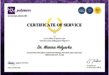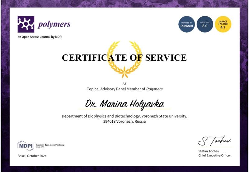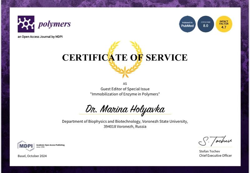 Профессора кафедры биофизики и биотехнологии медико-биологического факультета ВГУ Марину Холявка пригласили в качестве приглашённого редактора в тематический номер Immobilization of Enzyme in Polymers («Иммобилизация фермента в полимеры») журнала Polymers. Профессор ВГУ стала членом консультативной группы журнала.