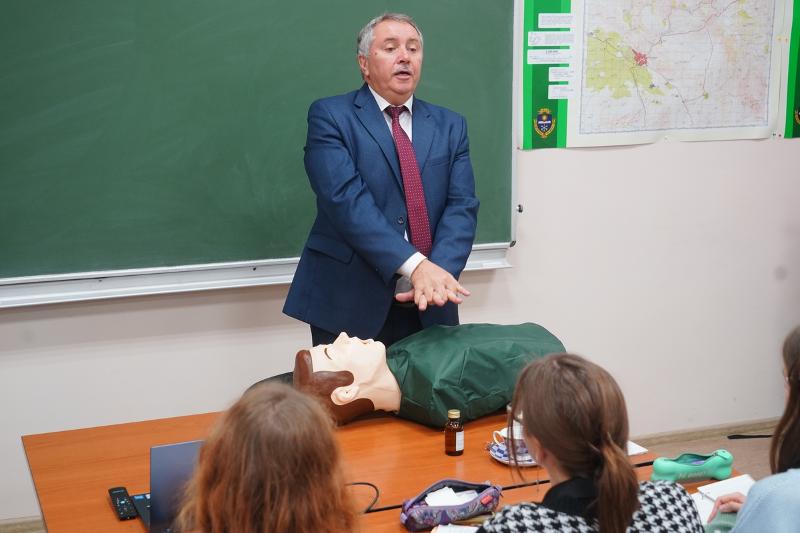 После осмотра укрытия, старший преподаватель кафедры БЖД, кандидат медицинских наук Геннадий Иванович Сапронов продемонстрировал процесс оказания первой помощи. Особое внимание он уделил сердечно-легочной реанимации, которая является ключевым навыком в случае остановки сердца. Студенты и сотрудники смогли увидеть, как правильно проводить эту процедуру, и получили практические рекомендации от опытного специалиста.