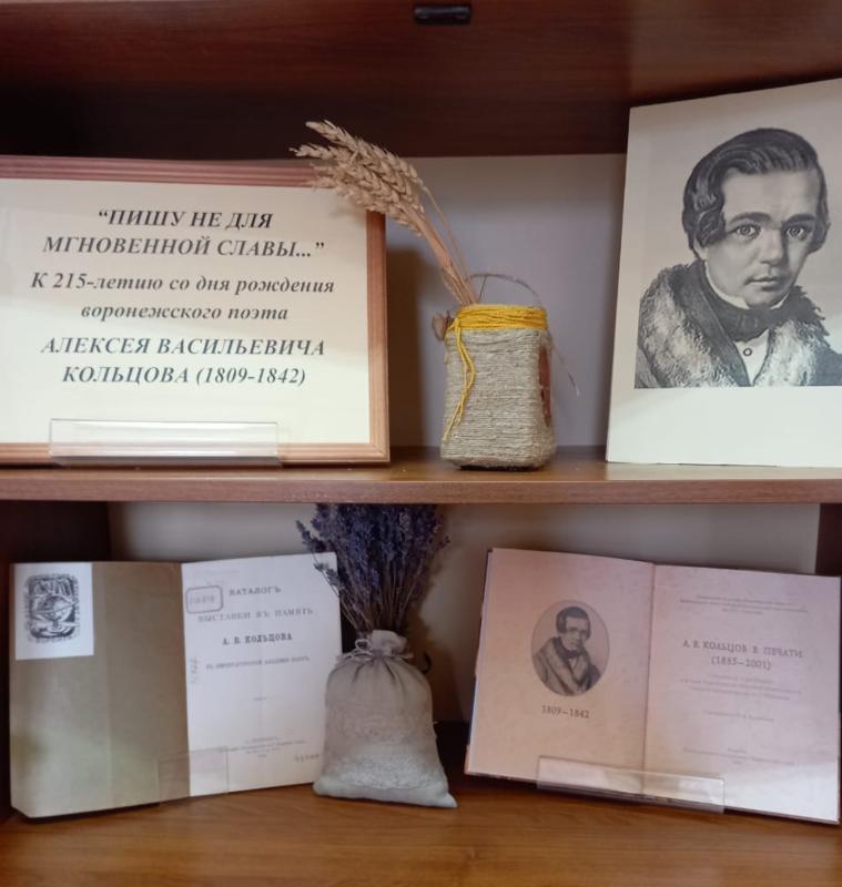 В Отделе редких книг Воронежского государственного университета открылась выставка, посвящённая 215-летию со дня рождения воронежского поэта Алексея Васильевича Кольцова. Вниманию читателей представлены труды о жизни и творчестве поэта, собрания стихотворений ХIХ – начала ХХ века, современные миниатюрные издания.