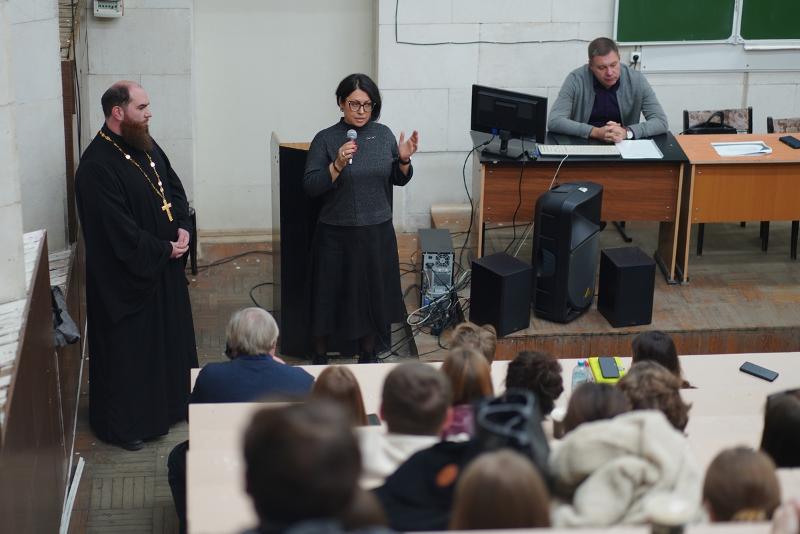 21 октября на факультете журналистики ВГУ прошла беседа с первокурсниками на тему «Освещение контента религиозной направленности». Спикерами выступили руководитель центра по вопросам сект и новых религиозных объединений, иерей отец Евгений Федорович Лищенюк, руководитель отдела по взаимоотношениям церкви с обществом и СМИ Татьяна Геннадьевна Меньшикова и специалист Координационного центра по направлению «Открытый диалог» Виктор Алексеевич Сливкин.