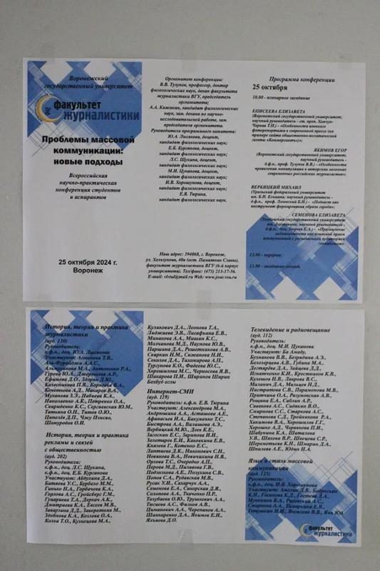 25 октября на базе факультета журналистики ВГУ прошла Всероссийская ежегодная научно-практическая конференция аспирантов и студентов «Проблемы массовой коммуникации: новые подходы». В этом году участие в конференции приняли авторы, представляющие разные города России и ближнего зарубежья: Астрахань, Белгород, Великий Новгород, Владивосток, Волгоград, Воронеж, Минск, Донецк, Екатеринбург, Иваново, Минск, Москву, Нижний Новгород, Ростов-на-Дону, Санкт-Петербург, Саратов, Ставрополь, Старый Оскол, Тамбов, Тирасполь, Тольятти, Челябинск.