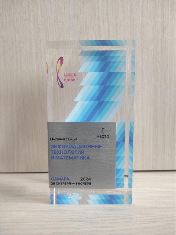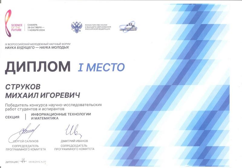 С 29 октября по 1 ноября на базе Самарского национального исследовательского университета имени академика С.П. Королёва прошёл IX Всероссийский молодёжный научный форум «Наука будущего – наука молодых». В рамках форума студент 1-го курса магистратуры математического факультета Михаил Струков получил Диплом I степени.