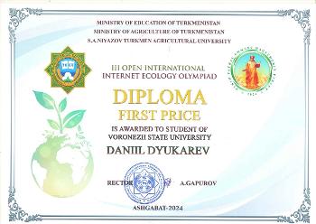 В начале декабря в Туркменском сельскохозяйственном университете имени С.А. Ниязова прошла III Открытая международная интернет-олимпиада по экологии среди студентов вузов страны и зарубежья, в которой приняли участие обучающиеся 1-го курса магистратуры факультета географии, геоэкологии и туризма ВГУ: Даниил Дюкарев и Полина Горбачева. Всего в олимпиаде приняли участие более 500 студентов из разных уголков мира.