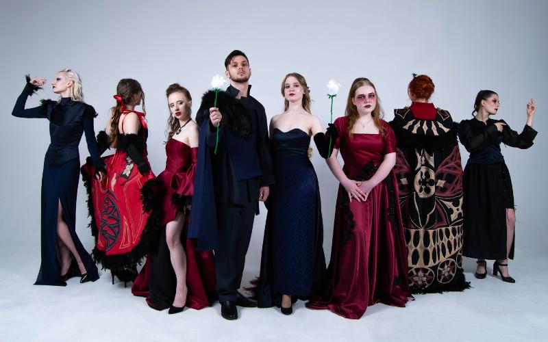 Силуэты наших нарядов олицетворяют полярность чувств, противостояние между страхом, от которого стынет кровь, и манящей строптивой притягательностью, от которой нельзя увести взгляд. Длинные и величественные платья с пышными юбками, акцентированной талией, придают нотку элегантности и разнообразия, позволяя каждой женщине чувствовать себя изысканно и уверенно. В то же время, облегающие фигуру контуры и корсеты, ярко подчёркивающие женственность, добавляют загадочности и азарта. А ключевой мужской образ, на котором мы видим плащ с мехом, вызывает трепет пред столь величественной и статной фигурой.