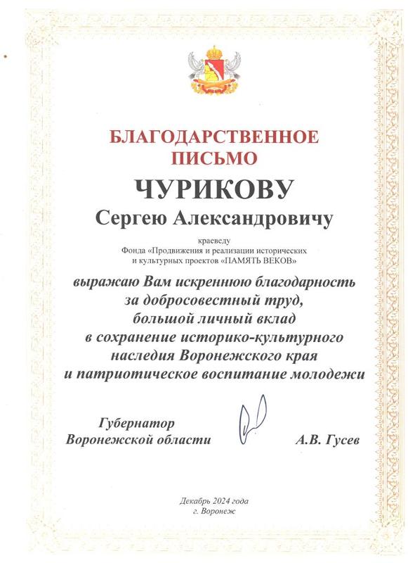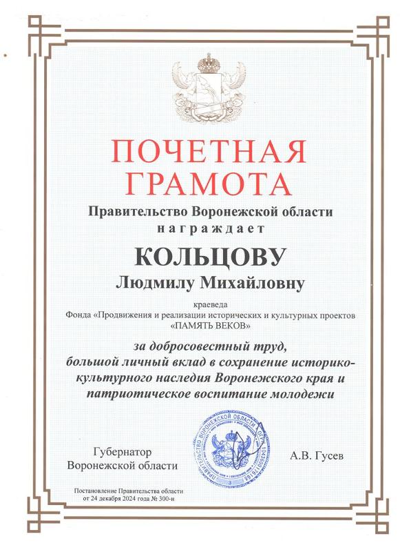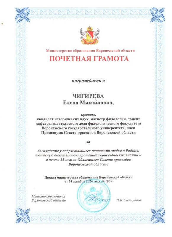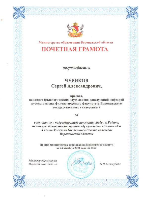 Сотрудники филологического факультета Воронежского государственного университета, краеведы: заведующий кафедрой русского языка Сергей Александрович Чуриков, профессор кафедры русского языка Людмила Михайловна Кольцова и доцент кафедры издательского дела Елена Михайловна Чигирева – награждены благодарственными письмами от губернатора Воронежской области А.В. Гусева и почётными грамотами от министра образования Воронежской области Н.В. Сологубовой за большой личный вклад в сохранение историко-культурного наследия Воронежского края и патриотическое воспитание молодёжи.