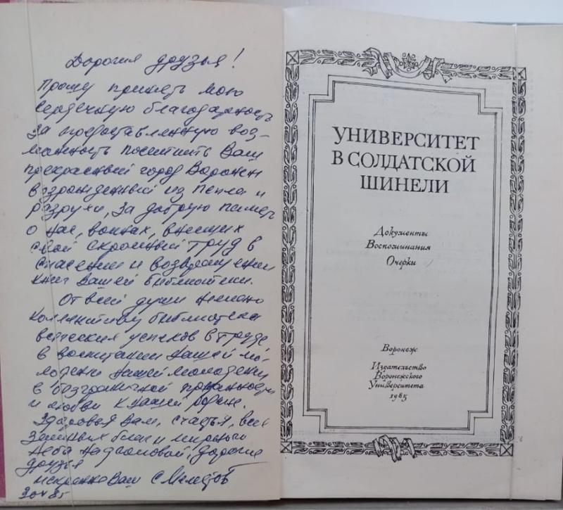 Книга «Университет в солдатской шинели: документы, воспоминания, очерки» (Воронеж, 1985) рассказывает о жизни университета в 1941–1945 годах, о преподавателях и студентах, ушедших на фронт, о тех, кто не вернулся с войны.