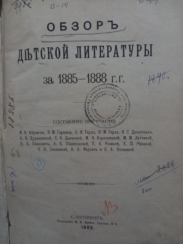«Обзор детской литературы за 1885–1888 годы», составленный при участии Я.В. Абрамова, В.М. Гаршина, А.Я. Герда и других авторов, увидел свет в 1889 году в Санкт-Петербурге.