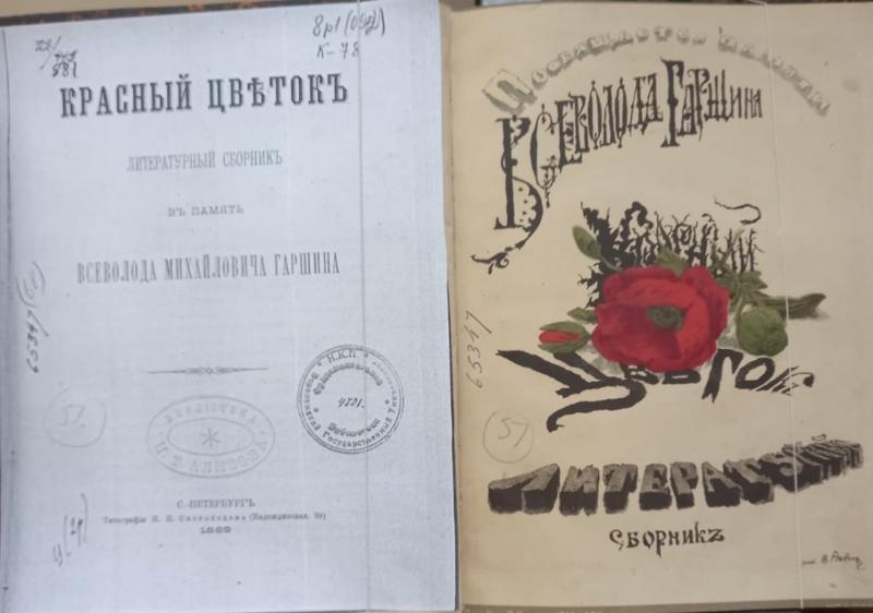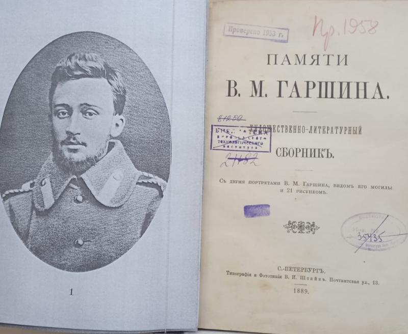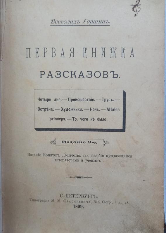 Среди трудов Всеволода Гаршина – девятое издание «Первой книжки рассказов» (СПб., 1899). В книгу вошли первые произведения Гаршина, которые принесли писателю всеобщее признание и сделали его имя широко известным в России и за границей. Литературный дебют – рассказ «Четыре дня» – сразу же был переведен на несколько европейских языков.