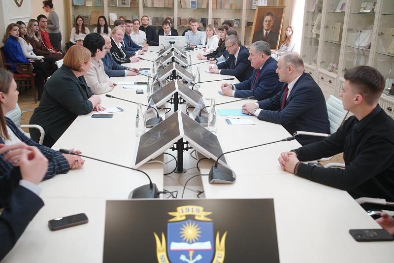 Студенты факультета международных отношений ВГУ приняли участие во встрече с Чрезвычайным и Полномочным Послом Николаем Михайловичем Владимиром. Встреча предоставила студентам возможность пообщаться с опытным дипломатом и задать интересующие их вопросы. Николай Михайлович поделился своим богатым профессиональным опытом, осветив ключевые аспекты работы на международной арене.