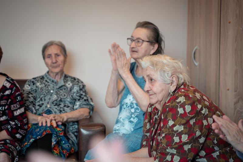 Активисты центра побеседовали с пожилыми людьми в тёплой атмосфере, а в конце встречи вместе с постояльцами пансионата исполнили известные советские песни – «Катюшу», «Смуглянку» и другие.