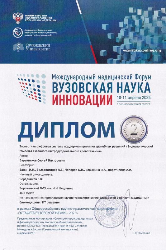 Проект «Экспертная цифровая система поддержки принятия врачебных решений «Эндоскопический гемостаз язвенного гастродуоденального кровотечения»» был высоко оценен экспертной комиссией в направлении «Прикладные научно-технологические разработки в области медицины и биомедицины: ИТ решения». Анастасия Воротилина выступила разработчиком программной части системы, которая помогает врачам принимать оптимальные решения при лечении язвенных гастродуоденальных кровотечений. Проект был реализован совместно с коллегами из Воронежского государственного медицинского университета им. Н.Н. Бурденко.