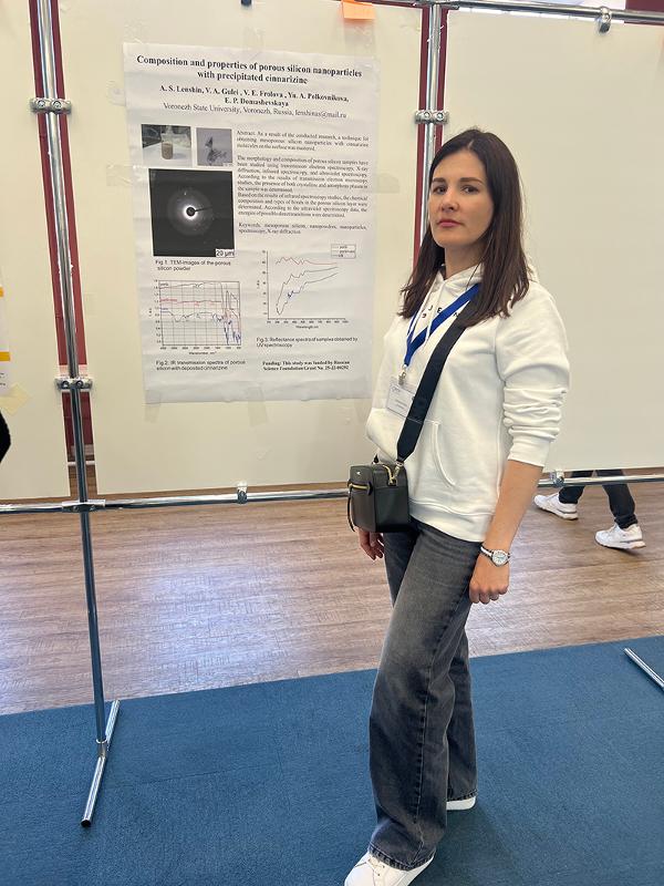 Воронежский государственный университет представляла кандидат физико-математических наук, доцент кафедры физики твердого тела и наноструктур Вера Евгеньевна Фролова с научными работами «Состав и свойства наночастиц пористого кремния с осаждённым циннаризином» (А.С. Леньшин, В.А. Гулей, В.Е. Фролова) и «Осаждение меди на пористом кремнии методом вакуумнотермического напыления» (К.Б. Ким, С.С. Черненко, С.И. Нифталиев, В.Е. Фролова). Научные исследования были выполнены при поддержке гранта Российского научного фонда № 25-22-00292 «Особенности строения, сорбционных и люминесцентных свойств гибридной системы ядро-оболочка на основе пористого кремния для адресной доставки лекарственных препаратов».