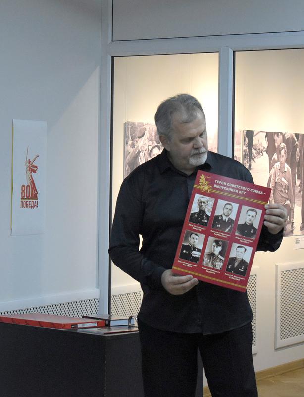 В рамках проекта «Наша победа», организованного по поручению губернатора Воронежской области А.В. Гусева, в залах Художественного музея им. И.Н. Крамского состоялась презентация книги директора Издательского дома ВГУ, члена Союза российских писателей Дмитрия Станиславовича Дьякова «Звёздные зачётки. Герои Советского Союза – выпускники ВГУ». Выход издания приурочен к 80-летию Победы в Великой Отечественной войне.