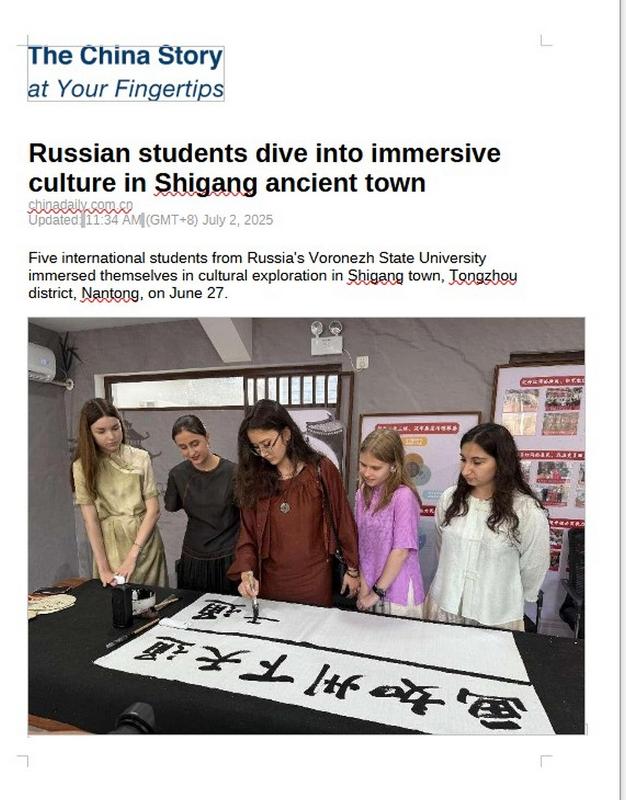 Одна из ведущих газет мира и самая влиятельная газета в Китае, «Женьминь жибао», официальное печатное издание Центрального комитета Коммунистической партии Китая, а также газета «China Daily» опубликовали материал о российских студентах, которые приняли участие в уникальном иммерсивном проекте «Открой мир красоты Тунчжоу». Мероприятие проходило в провинции Цзянсу при поддержке райкома Коммунистической партии Китая. Среди участников были представители из разных стран, включая студентов факультета РГФ ВГУ.