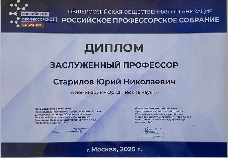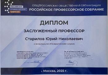 Исполняющий обязанности ректора ВГУ, профессор Юрий Николаевич Старилов награждён медалью и дипломом «Заслуженный профессор» в номинации «Юридические науки» Общероссийской общественной организации «Российское профессорское собрание».