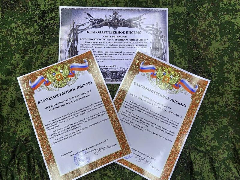 В адрес Совета ветеранов ВГУ, руководства профсоюзной организации сотрудников, Военного учебного центра также поступили Благодарственные письма от имени командования войсковой части.