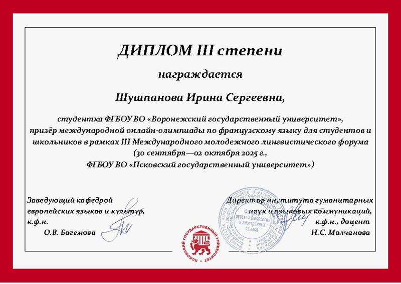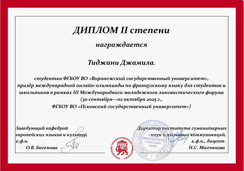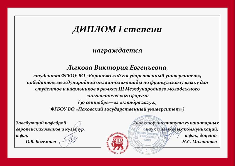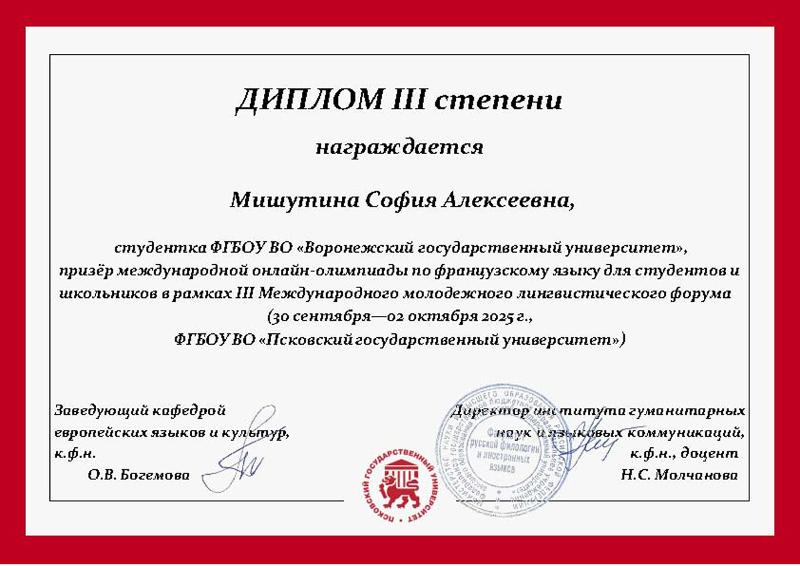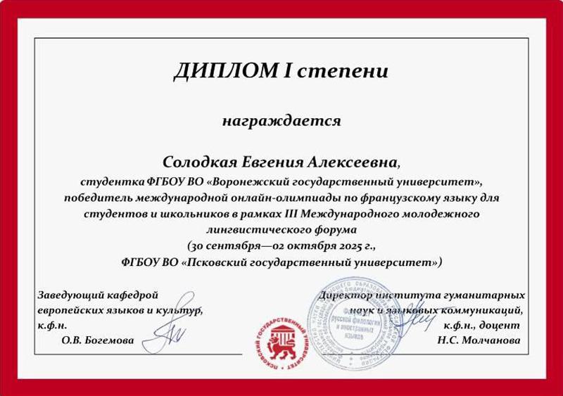 – Участие в онлайн-Олимпиаде по французскому языку в рамках III Международного молодежного лингвистического форума стало для меня чрезвычайно ценным опытом. Я горжусь тем, что смогла продемонстрировать свои знания и стать призером. Эта победа вдохновила меня на ещё более глубокое погружение во французский язык и культуру. Хочу выразить особую благодарность преподавателю кафедры французской филологии Елене Александровне Литвиновой за подготовку к участию в этом мероприятии.