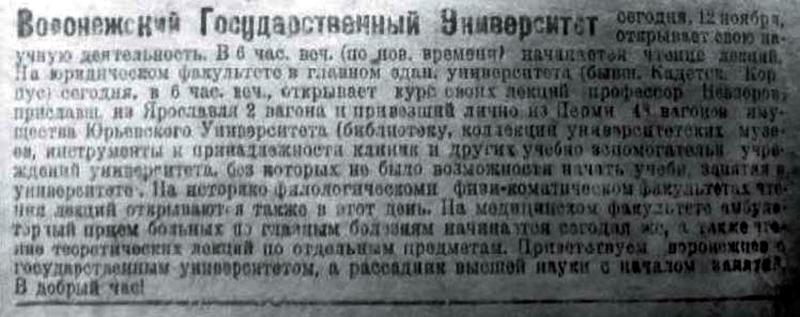 Газета «Известия Воронежского губернского исполнительного комитета Совета рабочих и крестьянских депутатов» писала 12 ноября 1918 года: «Приветствуем воронежцев с государственным университетом, а рассадник высшей науки – с началом занятий. В добрый час!»