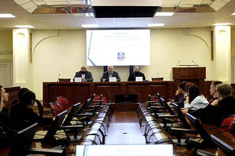Сегодня в Главном корпусе ВГУ состоялся Круглый стол по теме «Наука и религия: антагонизм, сосуществование или взаимопомощь». Мероприятие организовано в рамках Международного межрелигиозного молодёжного форума-2025».