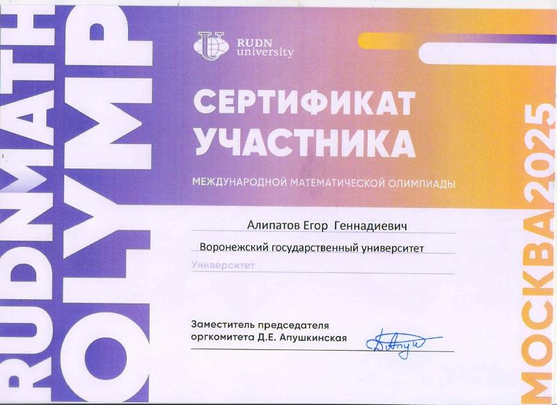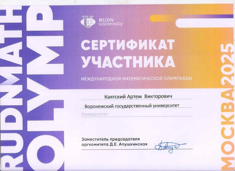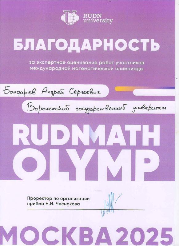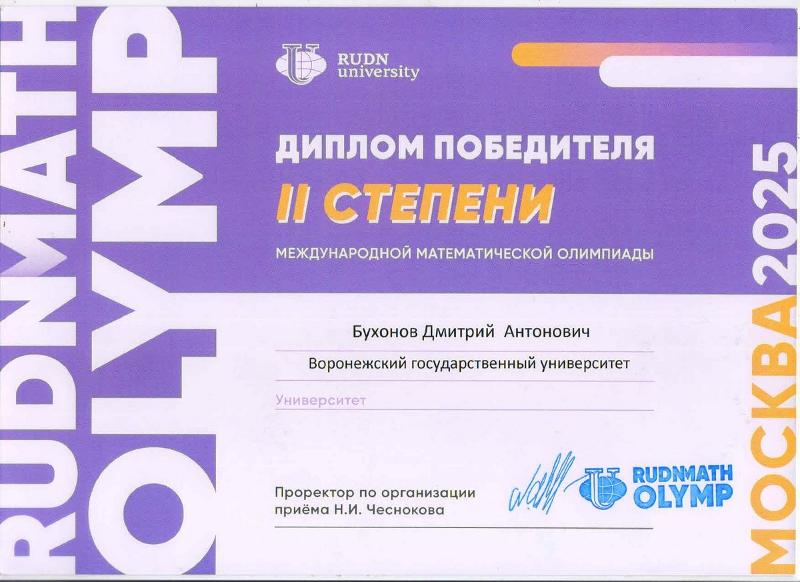 Студенты математического факультета Дмитрий Бухонов и Иван Маргацкий и студенты факультета ПММ Егор Алипатов и Артём Каятский под руководством доцента кафедры функционального анализа и операторных уравнений Андрея Сергеевича Бондарёва приняли очное участие в Третьей международной олимпиаде по математике «RUDNMATHOLYMP», проходившей в Российском университете дружбы народов. В очном формате в олимпиаде приняло участие порядка 400 студентов-бакалавров из вузов России, Узбекистана, Туркменистана, Казахстана, Алжира.