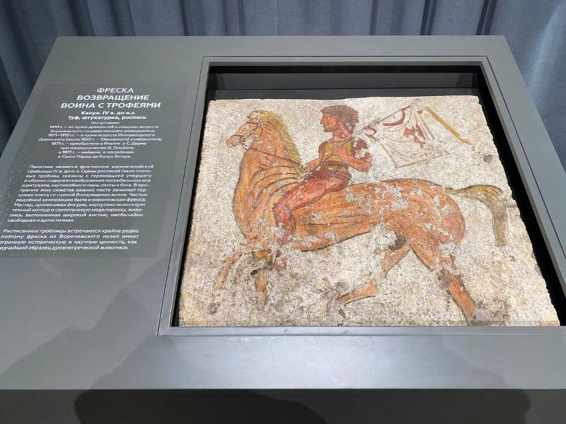 16 декабря 2025 года в Воронежском областном художественном музее им. И.Н. Крамского после реставрации в Центре имени академика И.Э. Грабаря была представлена уникальная античная фреска IV века до н. э. Этому событию была посвящена работа круглого стола «Возвращение воина». В обсуждении вопросов, касающихся истории памятника, его происхождения, иконографии, неразрывной связи античной коллекции музея с историей Воронежского государственного университета, приняли участие заместитель заведующего отделом искусства и археологии античного мира ГМИИ им. А.С. Пушкина, искусствовед, кандидат искусствоведения Ольга Виленовна Тугушева; реставратор высшей категории, кандидат искусствоведения, заведующий научно-реставрационной мастерской «Иконотека А.Н. Овчинникова» ВХНРЦ им. И.Э. Грабаря Александр Анатольевич Горматюк; кандидат искусствоведения, доцент кафедры всеобщей истории искусств МГУ Надежда Анатольевна Налимова; доктор исторических наук, профессор кафедры археологии и истории древнего мира ВГУ, декан исторического факультета ВГУ Елена Юрьевна Захарова; начальник отдела редких книг ЗНБ ВГУ Галина Сергеевна Ланцузская; учёный секретарь ВОХМ им. И.Н. Крамского, искусствовед, кандидат исторических наук Наталья Евгеньевна Бакина. Работу круглого стола открыла Юлия Николаевна Зайченко, директор ВОХМ им. И.Н. Крамского; модератором выступил главный хранитель музея Юрий Сергеевич Малик.