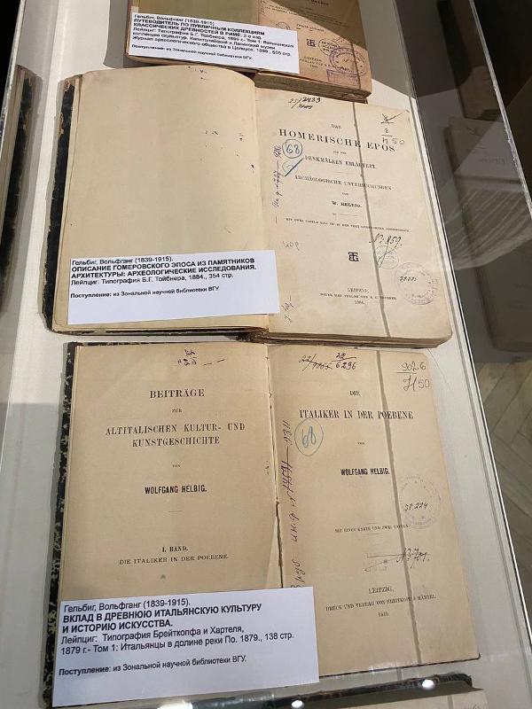 В рамках работы Круглого стола и торжественного открытия античного памятника была подготовлена книжная выставка из собрания Зональной научной библиотеки ВГУ, посвященная научным трудам Вольфганга Гельбига (1839–1915) – немецкого антиковеда, археолога, признанного знатока классического искусства. Именно при его посредничестве Музей императорского Дерптского университета в 1871–1872 годах приобрёл 31 античный памятник, в том числе, вырезанную из гробницы недалеко от итальянской Капуи фреску, изображающую всадника с копьём (так называемый сюжет «Возвращение воина»). В 1918 году, в связи с угрозой военных действий, экспонаты музея были эвакуированы в Воронеж, где они послужили основой античной коллекции художественного музея.