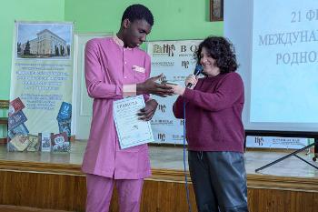 - в конкурсе для иностранных студентов первое место занял студент филологического факультета ВГУ Фай Мамаду Мансур (Сенегал); второе место – слушатель Воронежского института Министерства внутренних дел Российской Федерации Хужаев Имомаддин (Узбекистан) и студентка филологического факультета ВГУ Базарова Марал (Туркменистан); третье место – студентка филологического факультета ВГУ Хыдырова Боссан (Туркменистан), магистрант филологического факультета ВГУ Биран Диак и слушатель Воронежского института Министерства внутренних дел Российской Федерации Оганесян Армен (Абхазия);