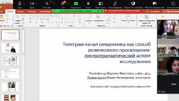 Доцент Елена Александровна Правда выступила с докладом «О некоторых особенностях сербских паремий, включающих сравнения», доцент Марьяна Яковлевна Розенфельд и магистрант факультета Мария Пришельцева сделали совместный доклад на тему «Телеграм-канал священника как способ религиозного просвещения: лингвопрагматический аспект исследования», заведующий кафедрой русского языка, доцент Сергей Александрович Чуриков, профессор Людмила Михайловна Кольцова и студентка филологического факультета Евгения Котенева также представили результаты совместного исследования «О лексикографической базе данных „Высокая лексика в русской речи XXI в.”». Доклады воронежских лингвистов вызвали живой интерес аудитории.