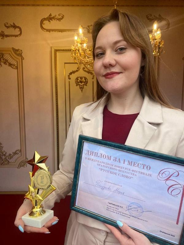 28 февраля в Новом Щепкинском фойе Малого театра состоялся заключительный этап III Международного конкурса-фестиваля ораторского искусства «Русское слово». Первое место в категории «студенты» заняла студентка 4 курса кафедры французской филологии факультета РГФ Мария Полуднева.