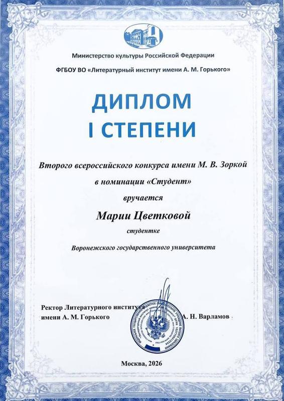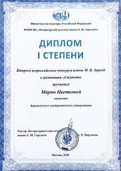 Студентка 5 курса специалитета «Перевод и переводоведение» кафедры романской филологии факультета РГФ Мария Цветкова заняла 1 место во Втором всероссийском переводческом конкурса имени М.В. Зоркой. Конкурс проводился в память о переводчике, профессоре кафедры художественного перевода Литературного института имени А.М. Горького Марии Владимировне Зоркой.