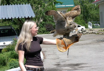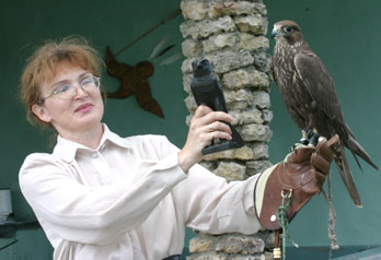 В питомнике содержатся многие виды хищных птиц. Сокол балобан.